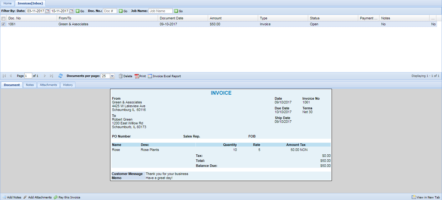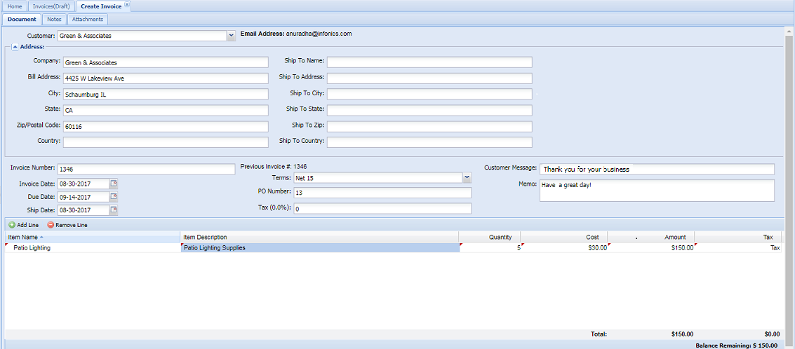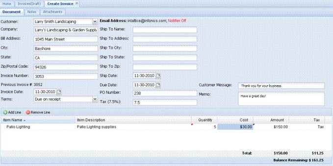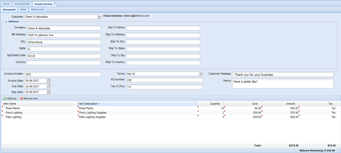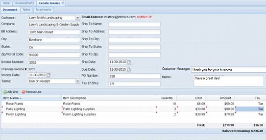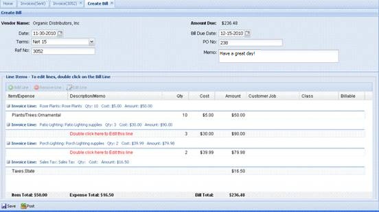 Vendor Creates an Invoice – with Rose Plants, Patio Lighting and Porch Lighting as Line Items.