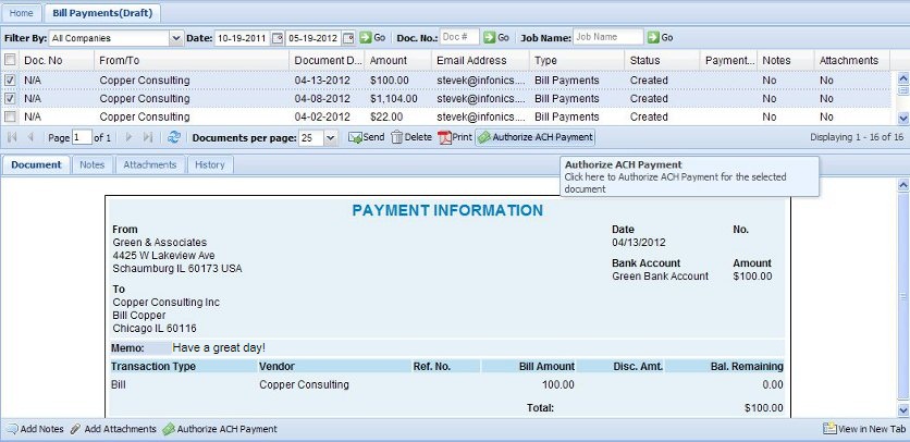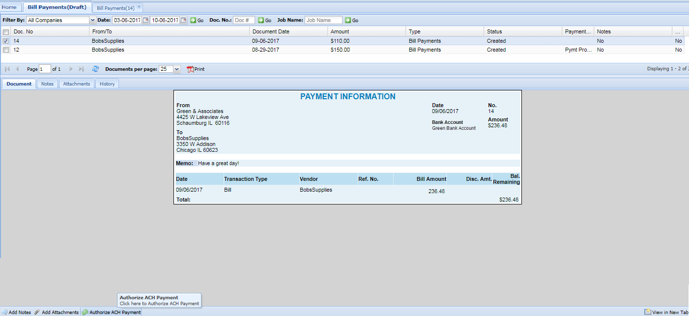 - You can authorize all payments by selecting all payments in draft folder and clicking on Authorize ACH payment
