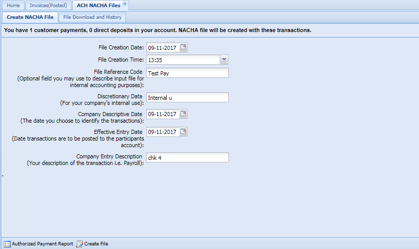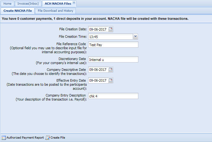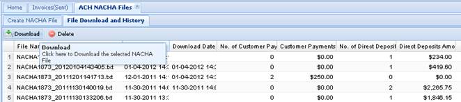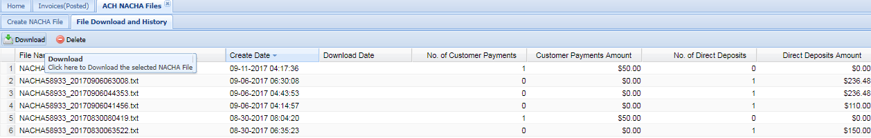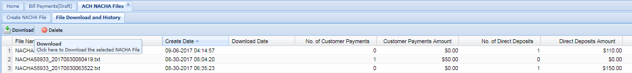 - Click on ACH NACHA file button and click on Create File button. You will be directed to the file download screen. Customers will receive an email notification, informing them about the debit to their account, if email notification option is enabled.