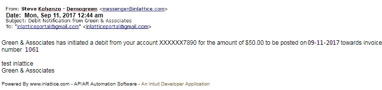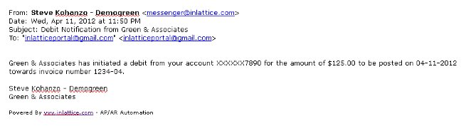 The process includes registration, one time setup of customer accounts with bank information, importing invoices, creating NACHA file and providing online access to customers.The ACH/NACHA file created by InLattice, needs to be submitted by you, to your bank for further processing. Please contact your bank for more information on requirements for processing NACHA file.