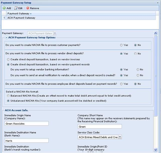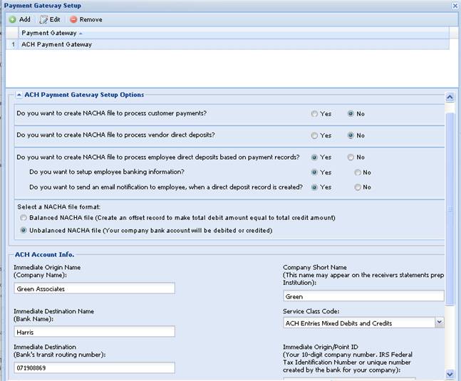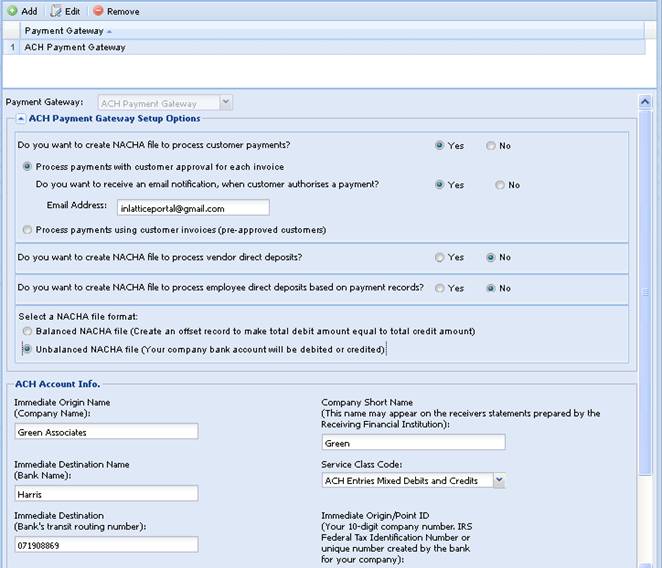 Setup ACH Payment Gateway Data – You need to have an ACH account with the Bank. This information is entered in Settings > Setup Payment Gateway > Add/Edit ACH Payment gateway option.