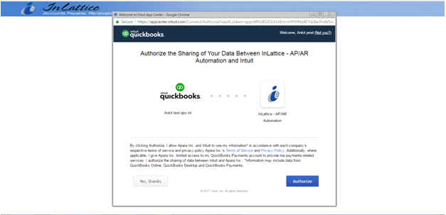 - After successful login, you will be asked to authorize the connection of your QuickBooks Online account with your InLattice account.
