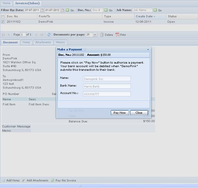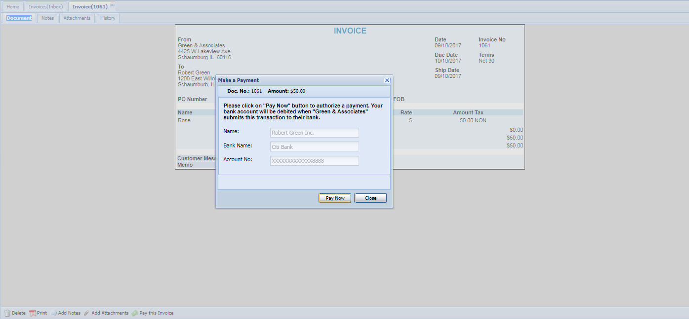- Customer can click on the link to view the invoice and click on “Pay this invoice” to authorize payments
