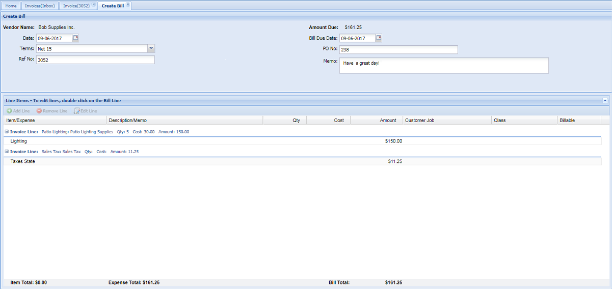 And you try to create the bill, the system automatically maps the Invoice lines to Bill Lines for Patio Lighting (in Invoice) to Lighting (in Bill).