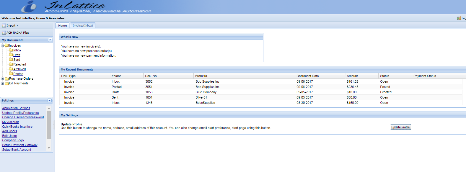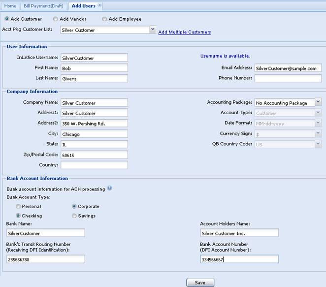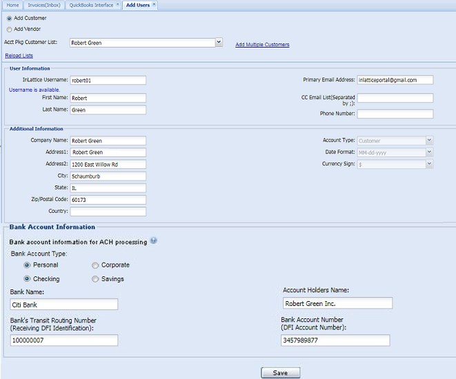 - Setup Customer Accounts in InLattice – Go to Settings > Add users to add customer accounts to InLattice. Based on your setup, you can also enter customer bank information here. You will receive email notification with customer userid and password. (InLattice Support Team can setup user accounts, after the customer list is uploaded to InLattice)