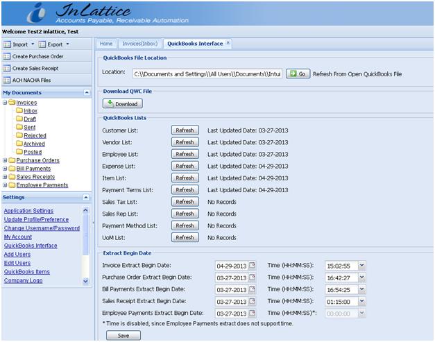 - Enter Invoice Extract Begin Date – Go to Settings > QuickBooks Interface >Enter Invoice Extract Begin Date and enter a date.