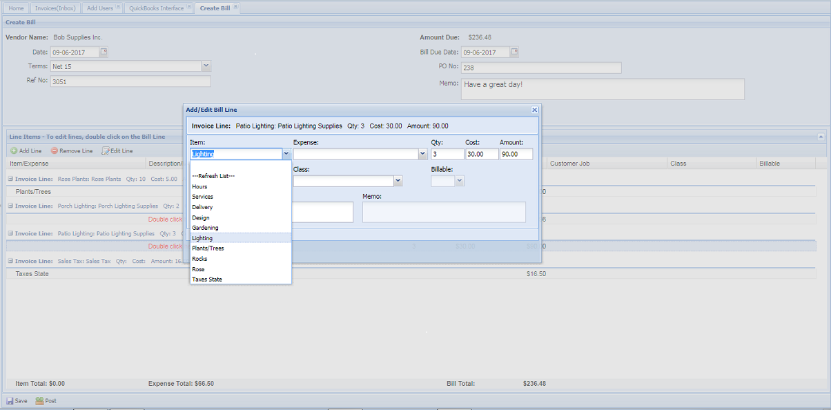 Create Bill – Once this Invoice is received, you will create a Bill, InLattice will automatically map the known items in the Invoice line to Bill Line. Notice that Rose Plants is already mapped however Porch Lighting and Patio Lighting is not mapped since this is the first Invoice from this Vendor using that item.