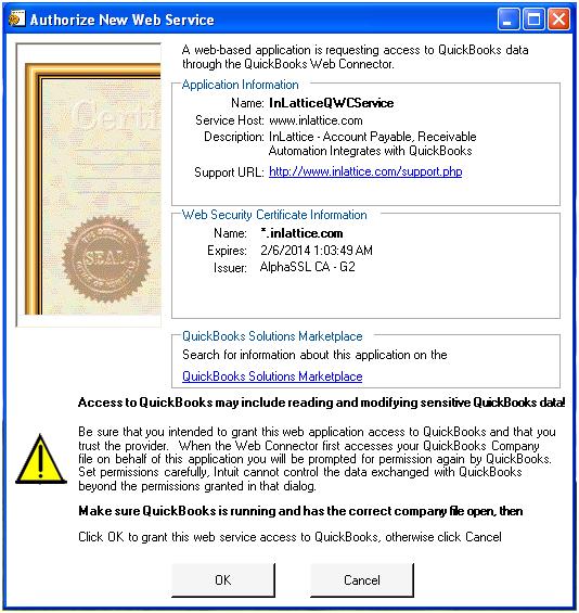 - Setup InLattice with the QuickBooks Web Connector – To begin this step, start QuickBooks on your computer and open your company file. Double click on the saved file InLattice_test2@infonics.com.qwc, the below window appears, click OK.