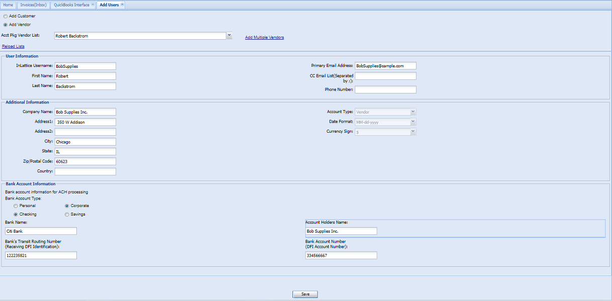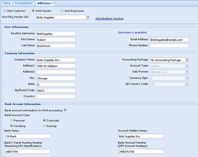 - Setup Vendor Accounts in InLattice – Go to Settings > Add users to add vendor accounts to InLattice. Based on your setup, you can also enter vendor bank information here. You will receive email notification with customer userid and password. (InLattice Support Team can setup user accounts, after the vendor list is uploaded to InLattice)