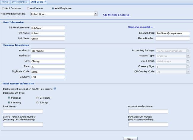 - Setup Employee Accounts in InLattice – Go to Settings > Add users to add employee accounts to InLattice. Based on your setup, you can also enter employee bank information here. You will receive email notification with employee userid and password. (InLattice Support Team can setup user accounts, after the vendor list is uploaded to InLattice)