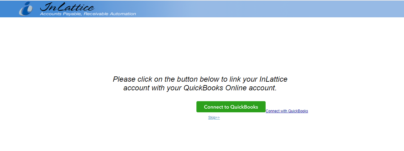 - When you login first time to InLattice, the screen shown below gives the option to link your InLattice account with your QuickBooks Online account.