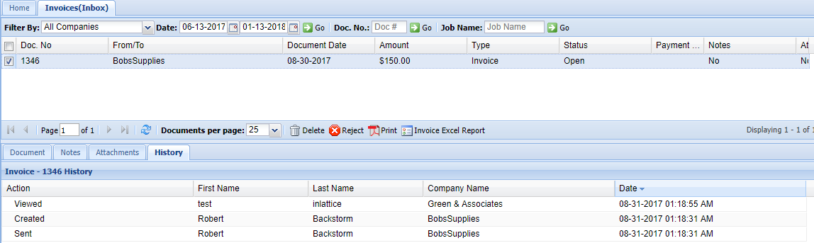 Vendor can see document history, including when the invoice was viewed, approved and posted to QuickBooks Desktop. Reduces vendor queries on invoice status.